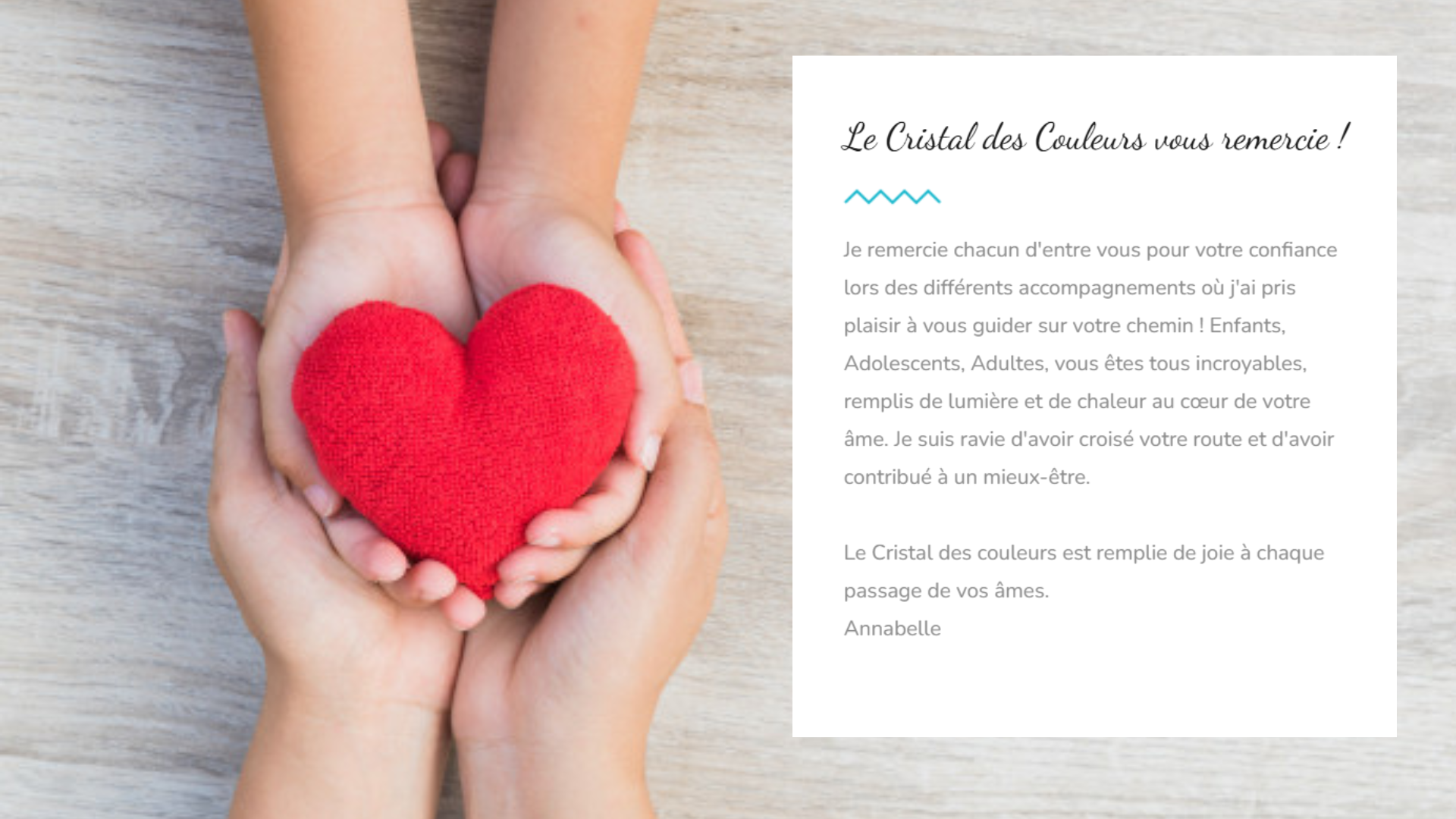 « Merci Annabelle pour cette belle séance en Chromothérapie, je recommande Annabelle pour sa douceur et son professionnalisme. A très bientôt
