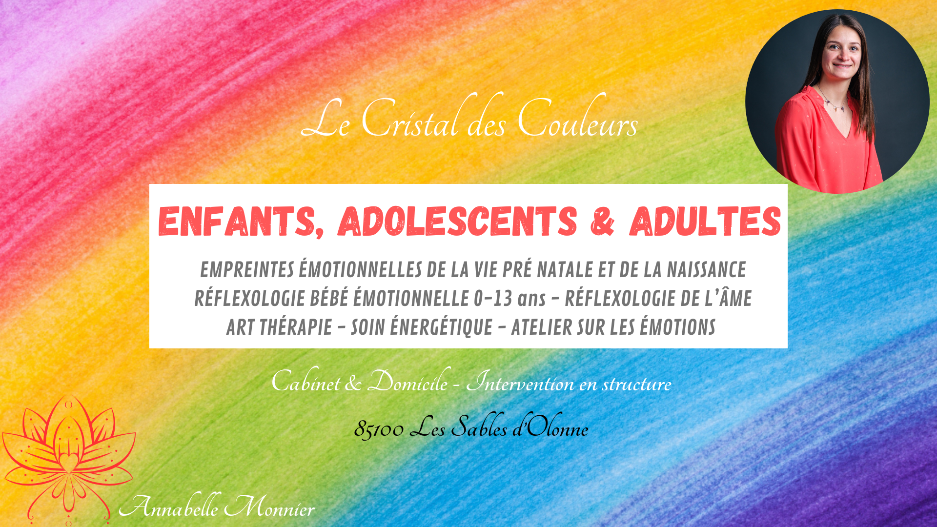 Le nom de mon entreprise reflète tout ce que je souhaite transmettre à travers mes pratiques. Le mot « couleurs » va lui symboliser la richesse de nos émotions et de nos énergies, car chaque couleur à une signification profonde et unique. En travaillant avec elles, nous pouvons révéler nos blocages; comprendre nos problématiques et explorer les multiples facettes de notre être. Quand au mot « cristal », il fait écho au lieu lumineux dans lequel je vous accueille, baigné de lumière et empli de sérénité, comme une bulle de clarté et de paix. Cela représente aussi notre essence intérieure, ce lieu pur et précieux en chacun de nous : l’âme. Nous sommes des êtres de cristal, des êtres lumineux capable de refléter la lumière et de retrouver l’harmonie en nous-mêmes.
